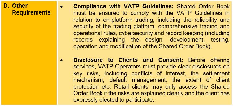 In light of the heightened risks from the Shared Order Book operation, VATP operators offering Shared Order Books are required to implement the following measures. VATP operators seeking to offer this service must obtain prior written approval from the SFC, with specific terms and conditions imposed on their licence.