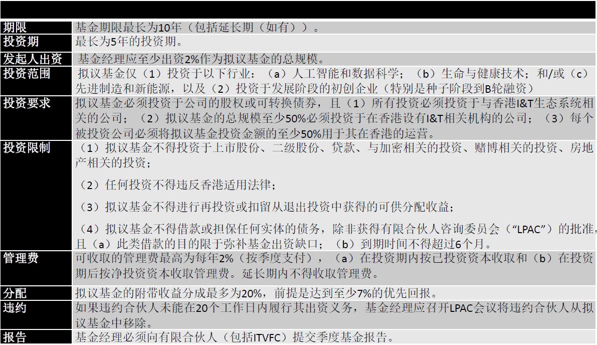 在2024年施政报告中宣布ITVF将重新部署15亿港元,与市场共同设立基金,以按比例匹配的方式,投资战略性行业的初创企业(“ITVF优化计划”)。该倡议旨在吸引更多私人投资,改善香港的初创企业生态系统。
