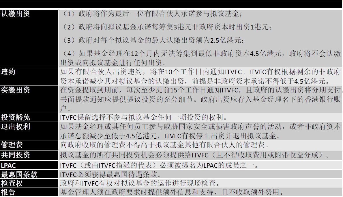 政府作为拟议基金的有限合伙人之一,将承诺每筹集3港元的非政府资金,就向拟议基金认缴1港元,政府对每只拟议基金的总认缴出资在1.5亿港元至2.5亿港元之间。
