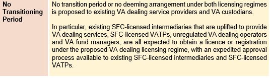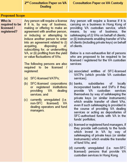The 2nd Consultation Paper on VA Dealing and Consultation Paper on VA Custody propose that either an open-ended licence (i.e. licence remains valid until revoked) or registration will be required for VA dealing service providers and VA custodian service providers.