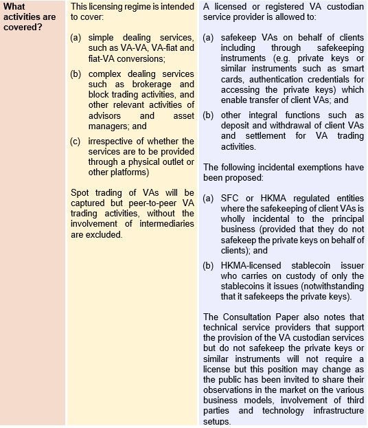 Drawing on the stakeholder feedback from the first consultation paper on the VA OTC trading regime, the 2nd Consultation Paper on VA Dealing proposes a broader legislative proposal, which (1) covers a wider range of settings including VA trading activities in physical locations, operations with mixed mode, digital-only platforms and payment networks, (2) includes more complex services such as trade settlements, and asset-management activities, (3) expands the clientele covering individual and institutional investors, small-and-medium enterprises, and other market participants, and (4) integrates VA custodial services into VA dealing activities.