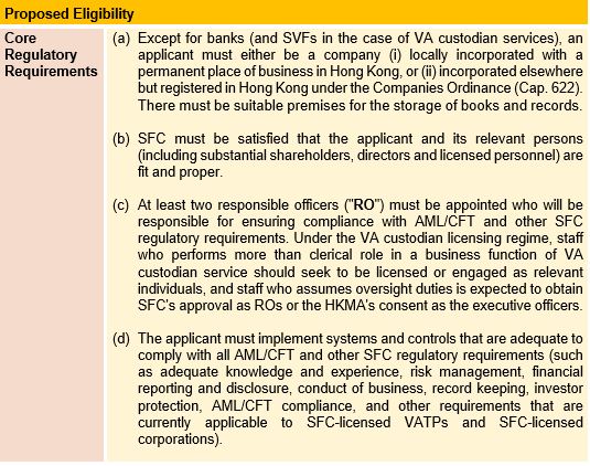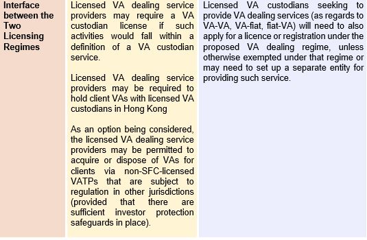 It is currently proposed that the SFC will be the licensing and registration authority and the standard setter for regulatory requirements applicable to licensed or registered VA dealing service providers and VA custodians.