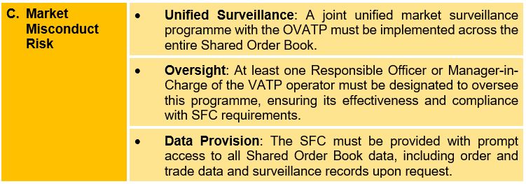 In light of the heightened risks from the Shared Order Book operation, VATP operators offering Shared Order Books are required to implement the following measures. VATP operators seeking to offer this service must obtain prior written approval from the SFC, with specific terms and conditions imposed on their licence.