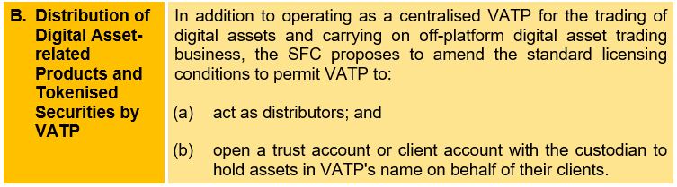 Under the Second Circular, the SFC expands the products and services that can be offered by SFC-licensed VATPs by (i) modifying the requirements on token admission; (ii) clarifying current regulatory requirements on VATPs for the distribution of tokenised securities and investment products relating to digital assets; and (iii) updating the requirements on VATPs providing custody services for their clients’ digital assets which may not have been made available for trading via the VATP.