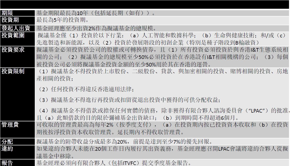 香港特別行政區政府(“政府”)於2017年成立20億港元創科創投基金(“ITVF”),旨在促進香港創新和科技(“I&T”)初創企業的投資。自2019年初首次投資以來,ITVF通過創科創投基金公司(“ITVFC”)與選定的風險投資基金作為共同投資夥伴,按約為1(ITVF):2(共同投資夥伴)的比例成功進行了共同投資,已向40家本地I&T初創企業投資超過3.3億港元。